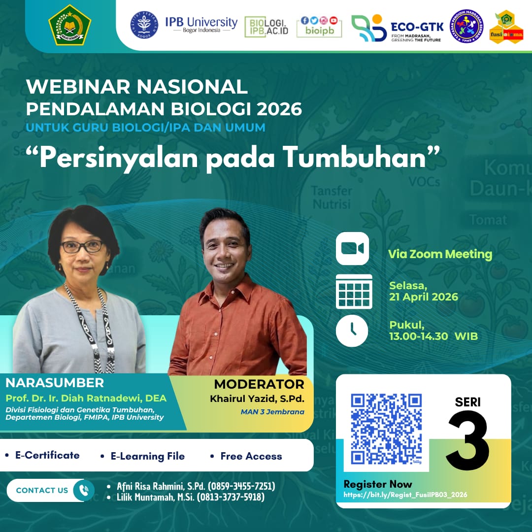 This event is organized by the Department of Biology, Faculty of Mathematics and Natural Sciences, IPB University, in collaboration with the National Forum for Biology Teachers at Madrasah Aliyah (Fusibioma)